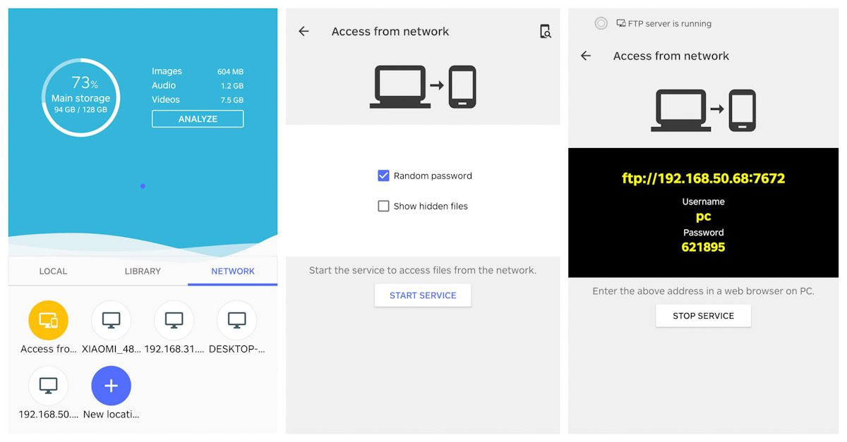 Step 1. Download and install Cx File Explorer from Google Play Store on your Android phone. Within the app, tap Access from the network under the Network tab and tap Start Service.