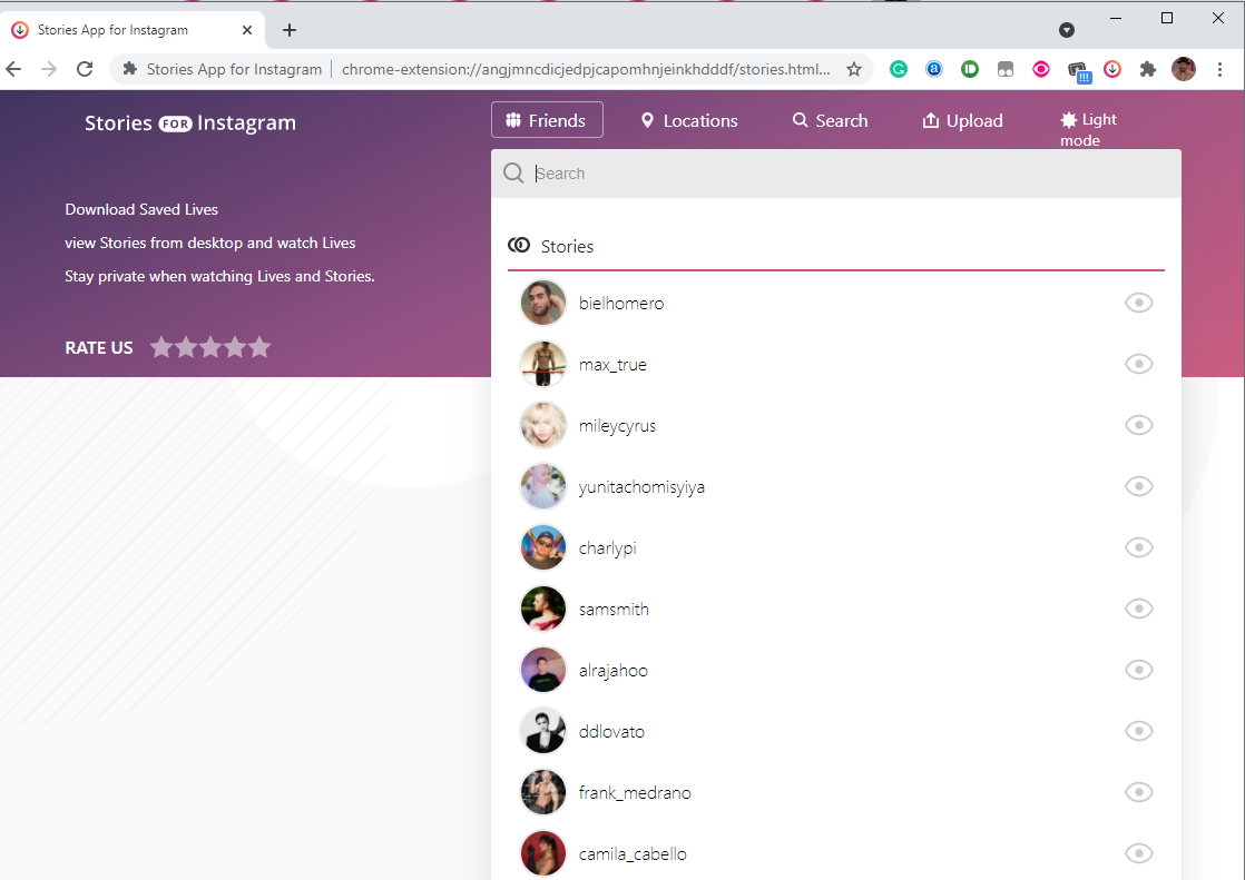 Instagram Stories is an extension for Google Chrome browser that allows you to view any Instagram stories without an account. After the installation, just click on the extension icon and select “Go to Stories”. In a newly opened tab, you can enter any Instagram username to view the available stories without an account.